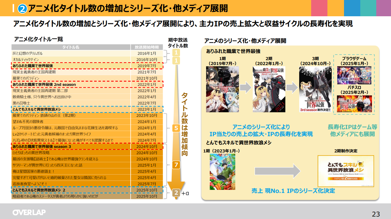 Aさん: そうですね。この成長は、同社が持つ多様なIP(知的財産)を活かしたメディアミックス戦略に基づいています。「ありふれた職業で世界最強」「とんでもスキルで異世界放浪メシ」などアニメ化やマンガ出版を通じて、既存のライトノベルから新たな収益を生み出しています。これが、安定した収益を実現している要因かもしれません。