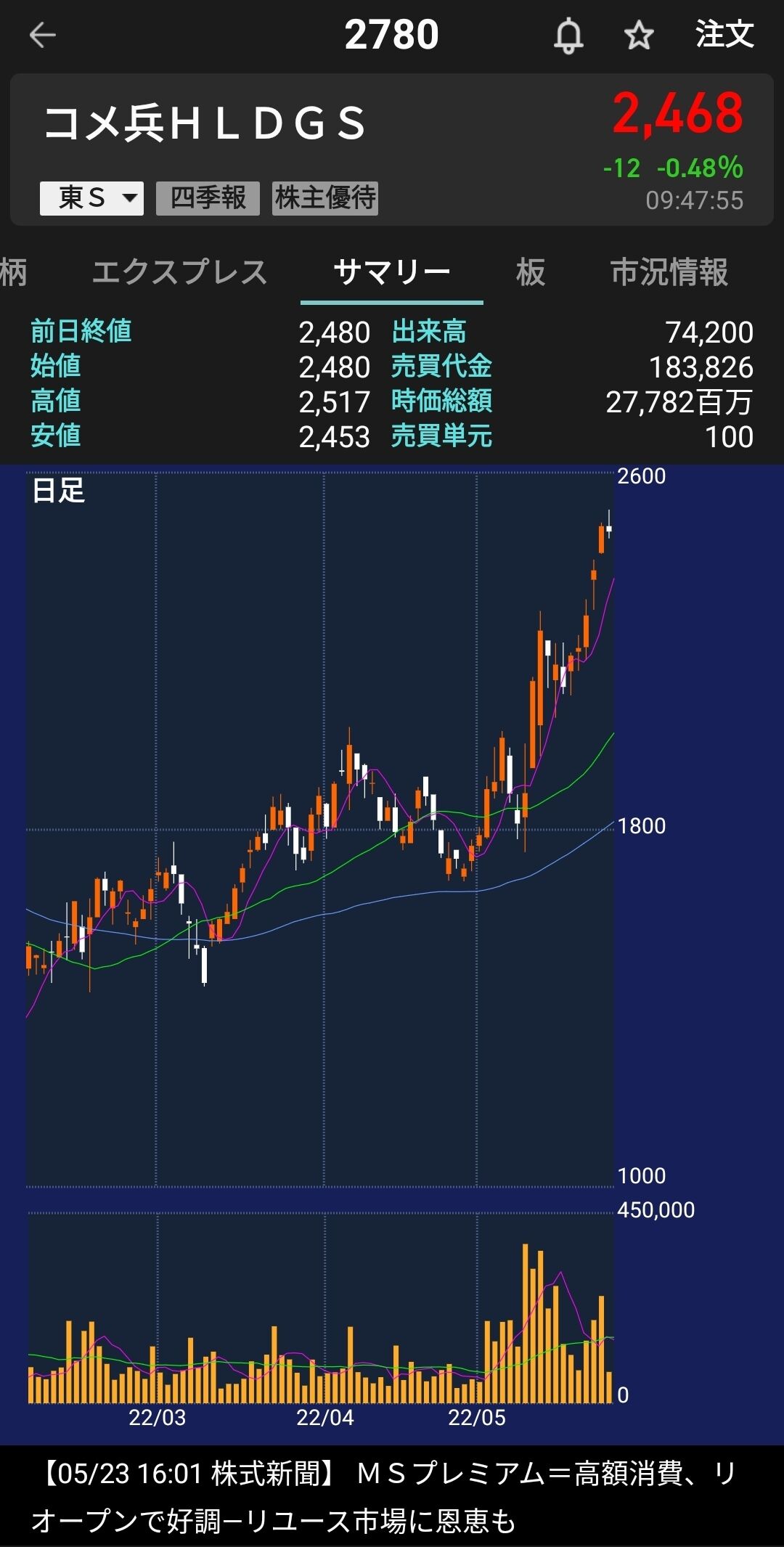 | 2780 | コメ兵ホールディングス | 中古ブランド品販売 | リユース関連 | 中古宝飾品セルビー子会社化 | 10.3倍 | 1.87 % | 13.0% | 0.42倍 | 進捗率39.3%(2Q時点) |