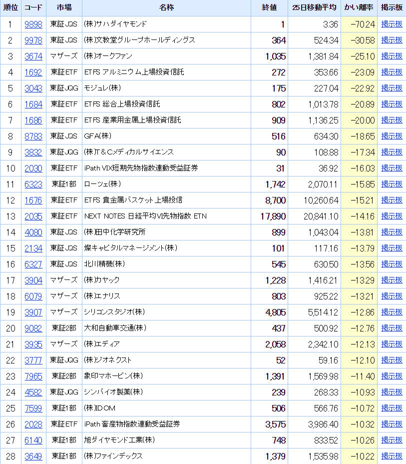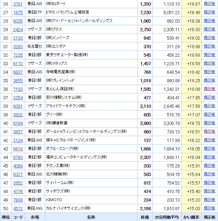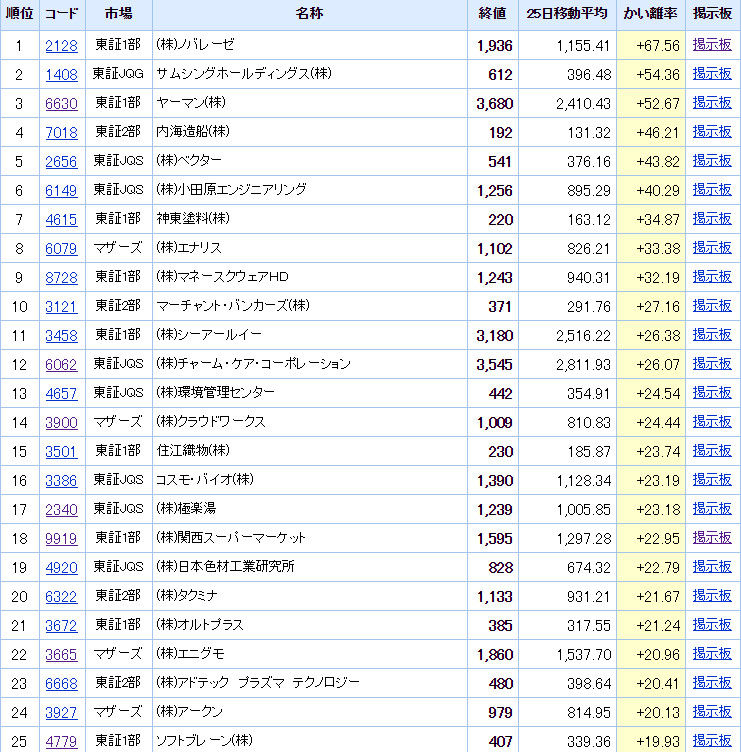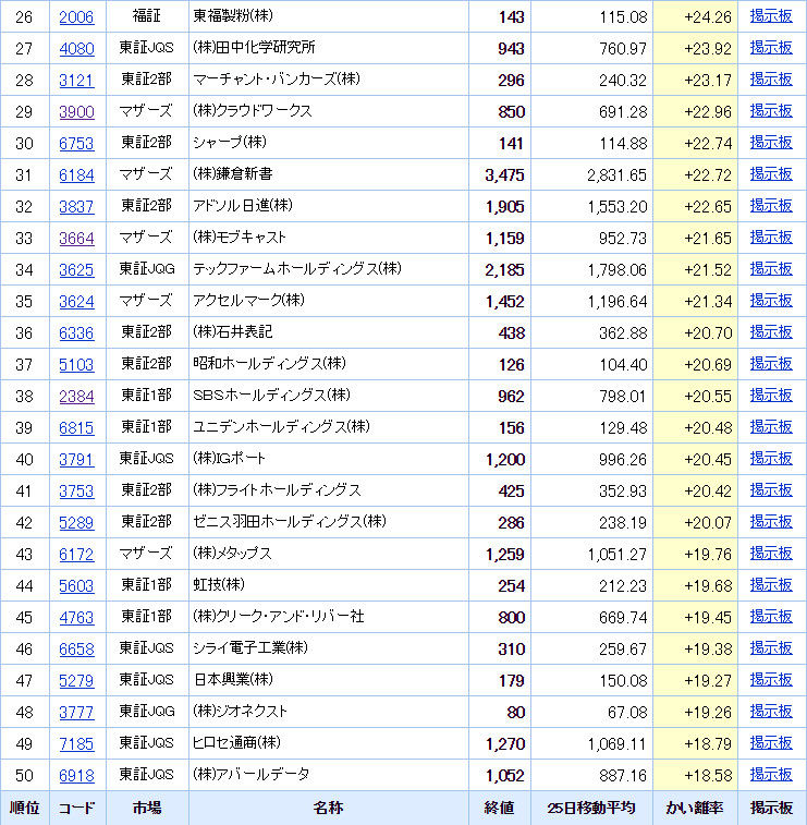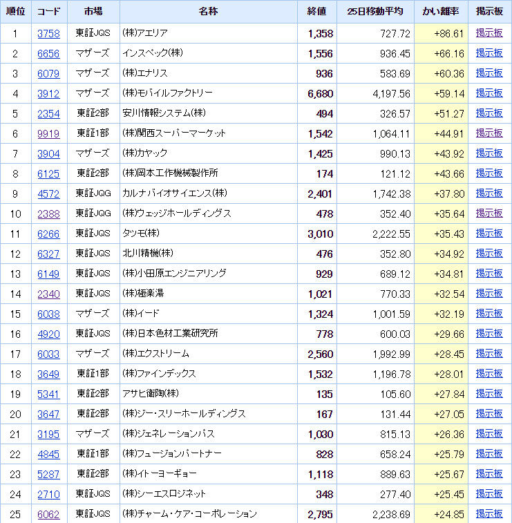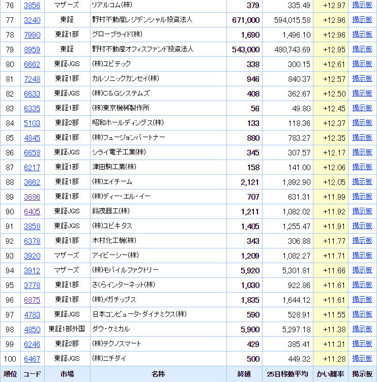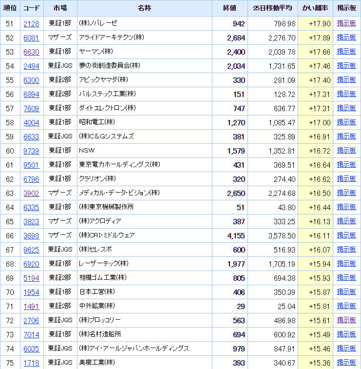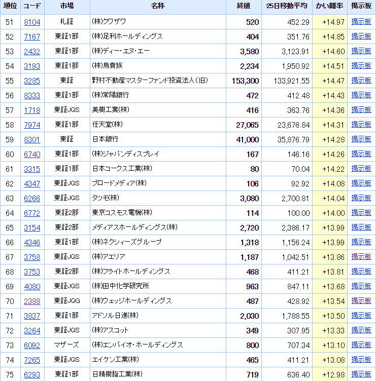 かい離マイナス銘柄が少ない、引き続き堅調相場。